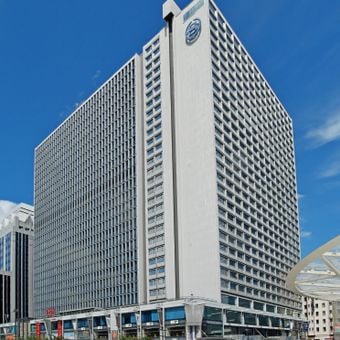 Manhattan Center is a modern tower about 102 meters tall that combines hotel rooms and commercial shops in Saint-Josse-ten-Noode. Its most noticeable feature is the regular grid of windows across the facade, which gives the building its distinctive appearance.