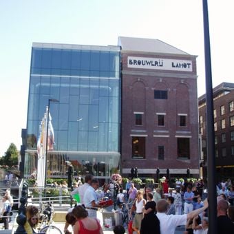 Brewery Lamot is a protected industrial building in central Mechelen combining original structures with modern additions. The complex features glass elements, open halls, and views across the surrounding city, with multiple levels connected throughout the site.