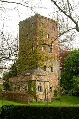 The Bierbais Tower features thick stone walls, narrow windows, and multiple levels constructed with both rubble masonry and brick materials throughout its structure.
