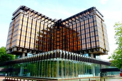 The building represents late 20th-century functionalist architecture in Brussels, emphasizing efficiency through its geometric forms and structural elements.
