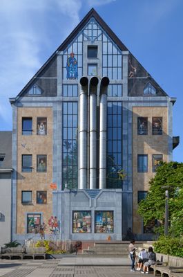 A 330-square-meter painting covers the entire gable of Namur City Hall extension, featuring 250 characters and regional symbols through detailed artwork.