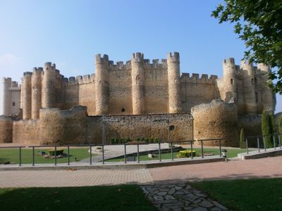 The Castle of Coyanza stands on a hill overlooking the Esla River meadows, featuring Gothic elements and prominent tower structures at 762 meters elevation.