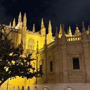Building started in 1402 on the site of a former mosque and continued for over a century. The old minaret was converted into the Giralda bell tower, which remains part of the complex today.