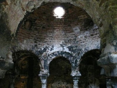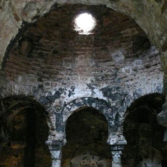 The Arab Baths feature stone columns supporting a domed ceiling with small openings that allow natural light to filter into the central circular room.