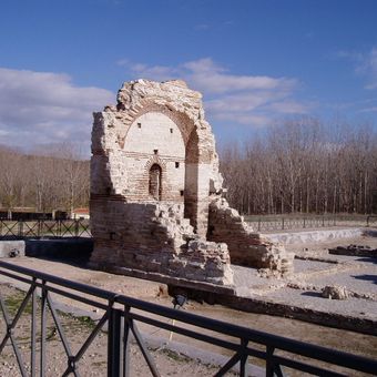 Villa romana de Carranque is a Roman archaeological site featuring a palace, mausoleum, and residential structures along the Guadarrama River. The complex spreads across several building areas containing dining rooms, reception halls, and bedrooms with marble floors and decorative wall treatments.