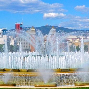 The Magic Fountain of Montjuïc is a monumental fountain in the Sants-Montjuïc district of Barcelona, composed of a central round basin surrounded by smaller pools of water. The installation spreads across a wide plaza at the foot of Montjuïc hill, with colored spotlights embedded in the ground and water jets positioned at different heights.