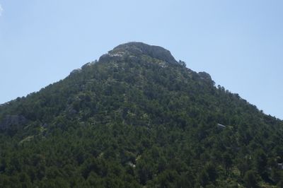 Puig de l'Ofre rises to 1093 meters above sea level in the Serra de Tramuntana range, featuring steep slopes covered with pine forests.
