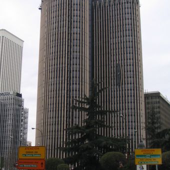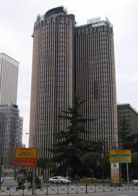 Torre Europa reaches 120 meters into the sky with its steel and glass facade, featuring 30 floors of office spaces in central Madrid.