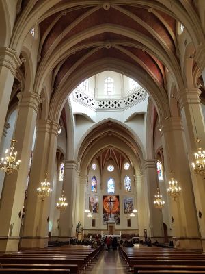 The Concatedral de Santa María features three naves with ribbed vaults supported by octagonal pillars and a pentagonal apse at its eastern end.