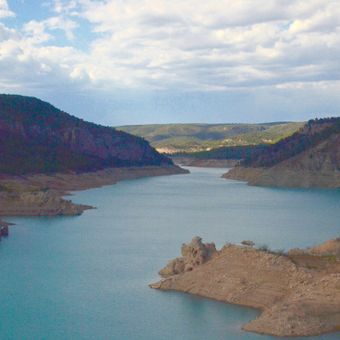 Embalse de Contreras is a reservoir in Cuenca Province, located at the border between Cuenca and Valencia regions. The water stretches across a narrow valley surrounded by rocky hillsides covered in pine forests and sparse vegetation.