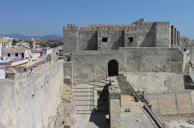 The Castle of Tarifa is a medieval fortress with thick walls and defensive towers arranged in a trapezoidal shape that follows the natural contours of the hilltop near the Strait of Gibraltar. The structure combines solid stone construction with strategic positioning to create overlapping fields of view and defensive protection.