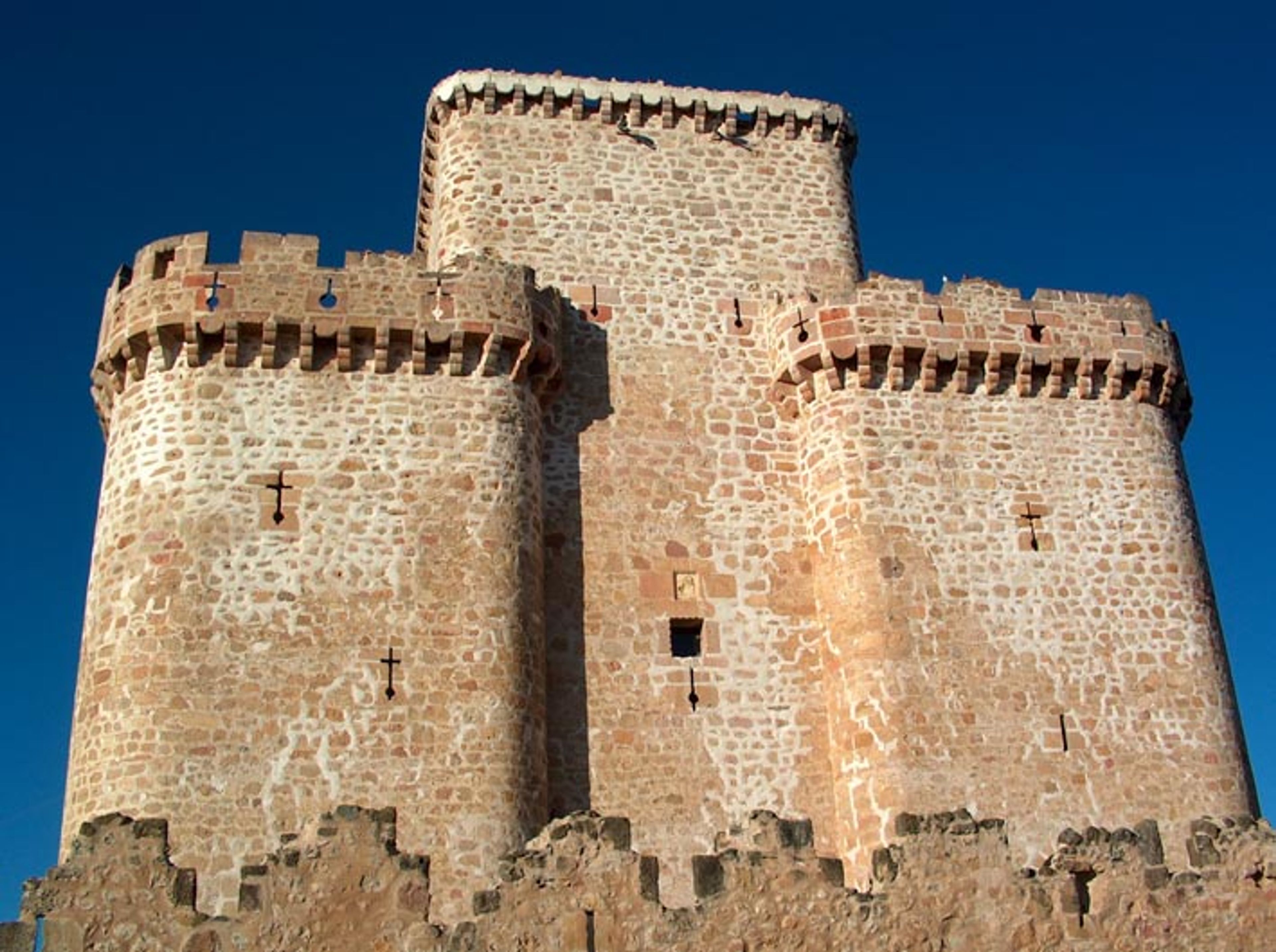 The Castle of Turégano stands with circular towers and a Baroque steeple, incorporating the Church of San Miguel within its rectangular structure.