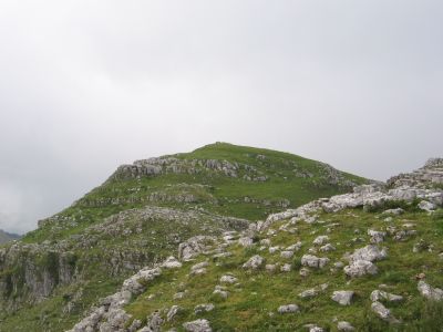A mountaineer postbox stands at the peak, surrounded by extensive grasslands that contrast with the sharp limestone formations beneath.
