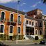 Casa Colón is a grand terracotta building with wrought-iron balconies organized around a central courtyard featuring gardens and a fountain. The structure contains multiple conference rooms and exhibition spaces designed for cultural events and gatherings.