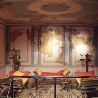 The triclinium dining room features walls decorated with paintings of cupids holding Jupiter's thunderbolts and vessels, along with Bacchus on the ceiling.