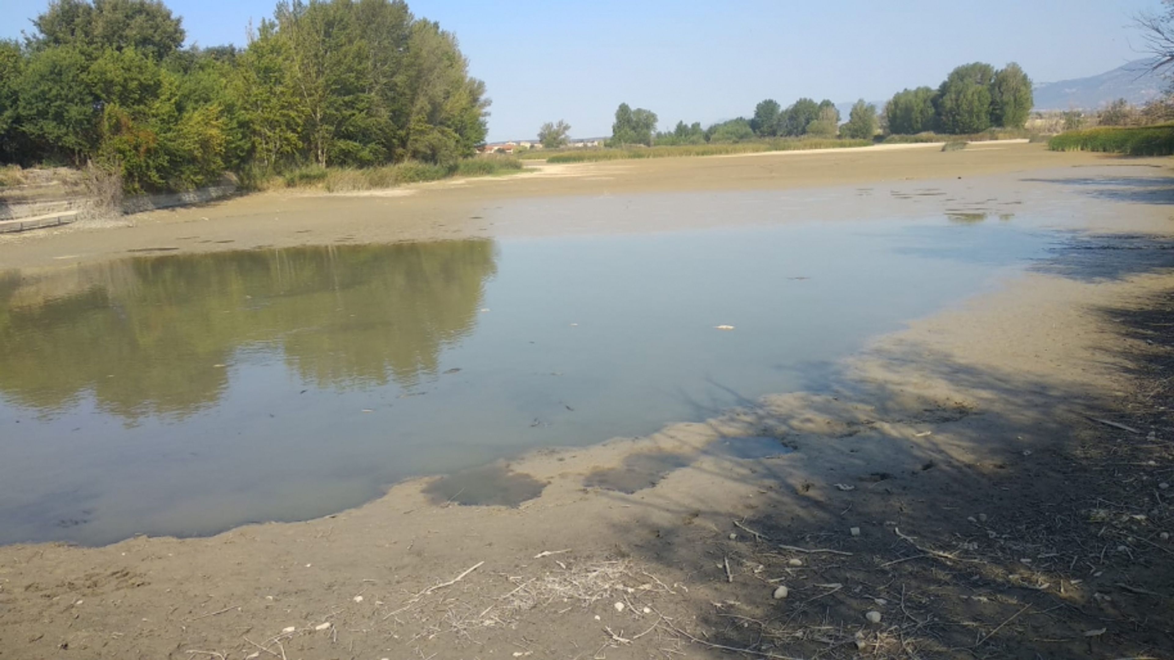 The sandy beach stretches over 650 meters along the Mediterranean Sea, featuring dark sand and moderate waves for swimming and water activities.