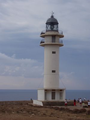 Barbaria Lighthouse stands on a rocky point at Formentera's southern tip and rises about 19 meters tall. It sends intermittent light signals visible from up to about 18 nautical miles away.