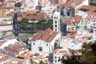 The Church of Santa Ana is a Catholic place of worship with a six-story white bell tower accented in dark tones in Garachico. The interior divides into three sections with columns and arches, and carved wooden elements shape the spaces.