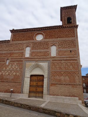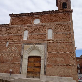 The Iglesia de Santa María displays detailed geometric patterns in its brickwork, featuring ornate window frames and decorative ceramic elements throughout its structure.