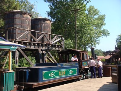 The train makes scheduled stops at designated stations in different themed areas, allowing visitors to efficiently move between distant sections of the park.