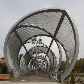 The Arganzuela Bridge is a pedestrian footbridge crossing the Manzanares River that stretches roughly 280 meters with two spiral metal structures that meet at the top. It accommodates both walkers and cyclists and features an elevated central point offering views of the river below.