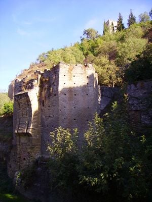 Puente del Cadí is a medieval bridge ruin in Granada featuring a distinctive hexagonal tower structure on the Darro River's bank. The remaining tower preserves traces of a horseshoe arch design and holds internal spiral staircase construction within its stone walls.