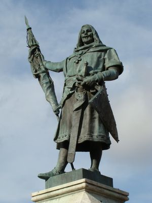 The bronze figure of Count Pedro Ansúrez stands 2.60 meters tall, holding a Castilian banner in his right hand and municipal scrolls in his left.