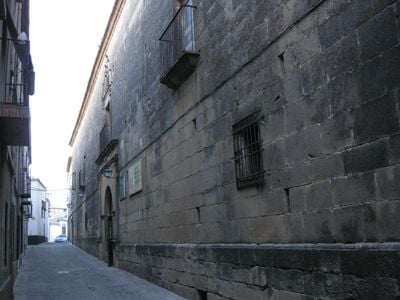 The palace features a stone facade with a cross of Santiago and two scallop shells, reflecting the architectural style of 16th century Spain.