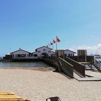 The beach provides complete facilities including showers, toilets, sun loungers, lifeguard services, and designated swimming areas for families.