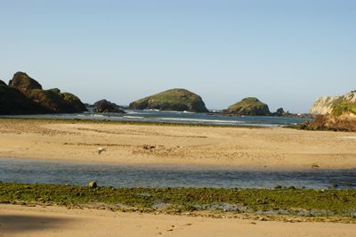 The triangular-shaped beach sits at the mouth of the Porcía River, featuring golden sands and clear waters along the Asturian coast.