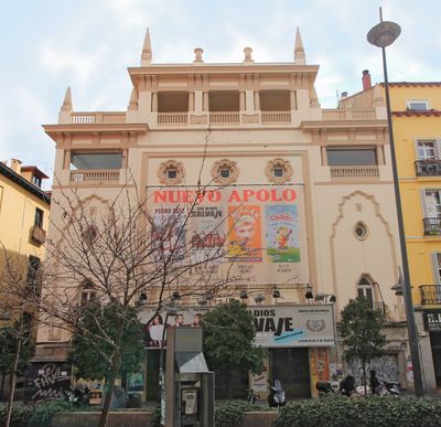 The Teatro Nuevo Apolo is a performance theater in Madrid's Embajadores neighborhood with a pseudo-baroque facade that incorporates art deco elements. The building holds 495 seats and provides spaces for wheelchair users, while its mezzanine level features low relief carvings depicting zarzuela themes.