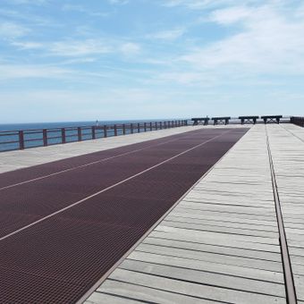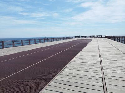 The massive iron structure stretches from the railway terminal to the sea, featuring stone pillars and metal beams for mineral transportation.
