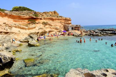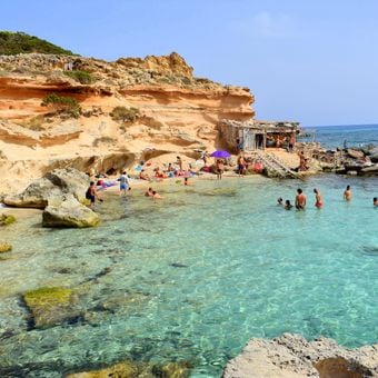 The cove maintains the Formentera tradition of naturism, with visitors freely choosing between conventional and nude bathing.