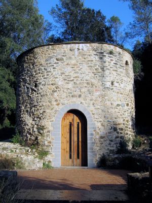 Ermita de Sant Adjutori is a small stone church with a semi-spherical vault and round windows that resemble ship portholes, built in a circular design. The entrance faces the woodland, and the structure displays distinct construction methods across three different levels.