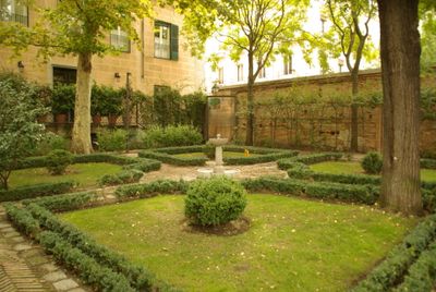 The Garden of the Prince of Anglona is a private garden in the La Latina district featuring geometric patterns of boxwood hedges surrounding a central marble fountain within approximately 800 square meters. The space is enclosed by walls that shield it from the city and holds Mediterranean plantings arranged in classic layouts.
