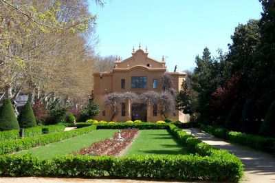 Camps Elisis is a public park in the Cappont district of Lleida with botanical gardens designed in French and English styles, housing structures like the Glass Palace and the Mermaid Fountain throughout its landscaped grounds. The space includes two children's playgrounds, restrooms, and decorative fountains with statues distributed across the property.