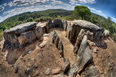 The burial chambers feature different architectural configurations, including gallery-type dolmens with central supports and false dome structures built with vertical orthostats.