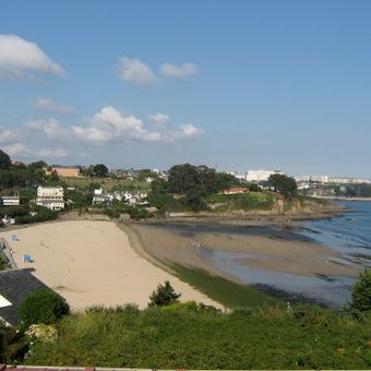 The beach extends 500 meters in length and 100 meters in width, featuring soft golden sand between two rocky structures covered with vegetation.