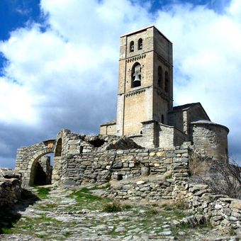 The church combines Romanesque and Gothic design elements, featuring a Latin cross layout with a cylindrical apse adorned with corbels at 569 meters elevation.