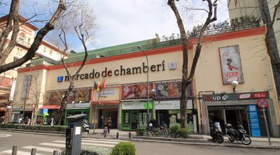 Mercado de Chamberí is a market hall in a Madrid neighborhood with several food stalls selling regional products and fresh items. The building combines ground-floor retail with other functions in the upper levels.