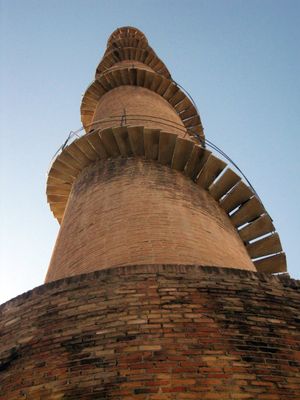 The Chimney of bòbila Almirall is a tall brick structure that tapers gradually from its wide base toward the top. Inside, an iron spiral staircase connects multiple viewing platforms and makes the structure accessible from bottom to top.