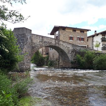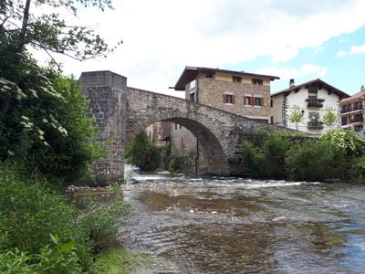 The bridge maintains its original limestone structure and continues to serve as a crossing point for both pedestrians and vehicles in the Esteribar region.