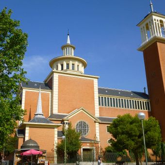 The religious building stands in front of Santa Gema Plaza, near Santiago Bernabéu Stadium, featuring red brick walls and an octagonal dome.