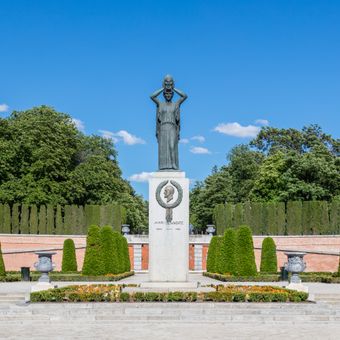 The sculpture combines both bust and memorial elements, creating a lasting tribute to a writer who produced 172 theatrical works throughout his lifetime.