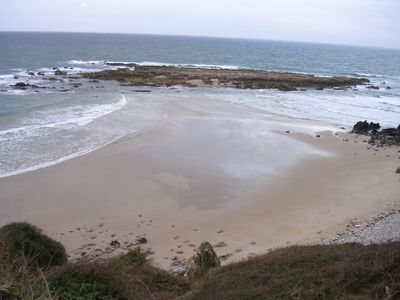 The beach is accessed via a steep path near the camping area or along a road to small parking areas. Wear sturdy shoes for the climb, and pay attention to tide times if you want to explore the islet at low tide.