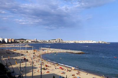 The beach extends 1.5 kilometers along Costa Brava with three T-shaped piers dividing the golden sand into distinct sections of shallow waters.