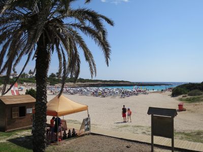 Located 10 kilometers from Ciutadella center, the beach provides full amenities including umbrella rentals, showers, and water activities.