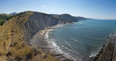 The geological formations at Sakoneta beach developed over millions of years through the continuous action of waves against the limestone cliffs.