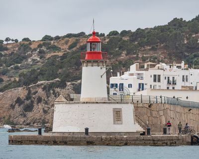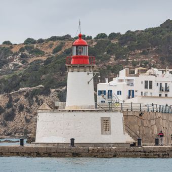 The Ibiza Dique de Abrigo lighthouse stands at the entrance of Ibiza harbor, featuring a distinct red light signal that flashes every three seconds.