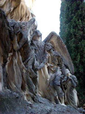 The monument showcases the collaborative work of sculptor Agustí Querol Subirats and architect Ignacio de Aldama Elorz, featuring flowing sculptural movements that embody modernist aesthetics in Spanish funerary art.